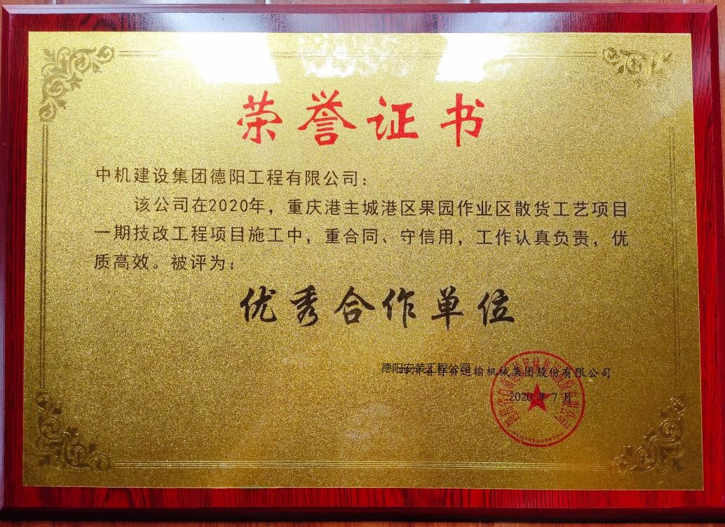2020年7月,中機德陽有限公司承接的“重慶港主城港區(qū)果園作業(yè)區(qū)散貨工藝項目技改”項目,被業(yè)主方四川省自貢運輸機械集團股份有限公司授予“優(yōu)秀合作單位”稱號。